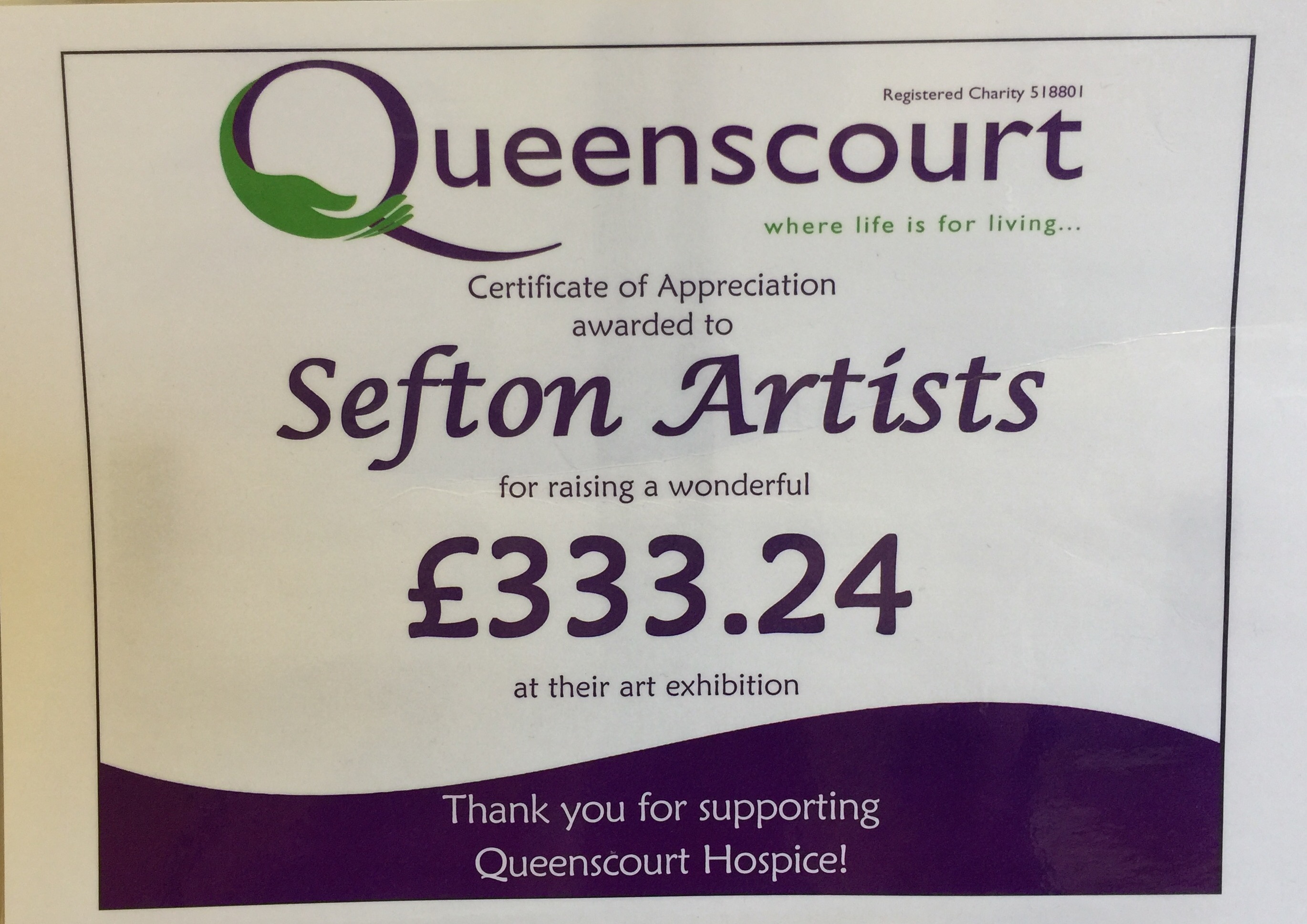 We are proud to support Queenscourt Hospice in all of our Wayfarers Exhibitions by donations & collections.